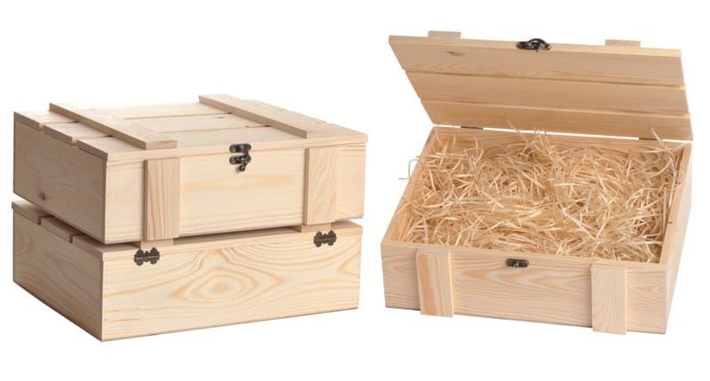 Kuferek na wino w kolorze naturalnym. Idealna skrzynka upominkowa na trzy butelki wina, ekologiczne i eleganckie opakowanie wykonane z drewna sosnowego.